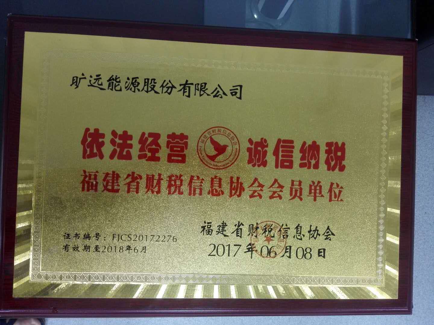 2017年6月 獲得福建省財(cái)稅信息協(xié)會(huì)頒發(fā)的“依法經(jīng)營(yíng) 誠(chéng)信納稅”。