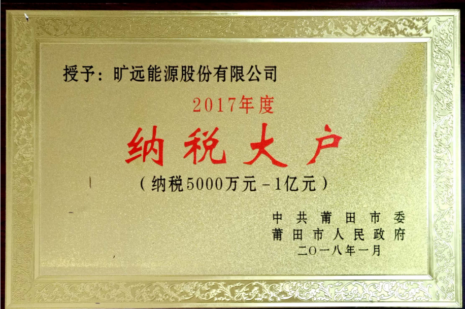 2018年01月 曠遠(yuǎn)能源股份有限公司被中共莆田市委、莆田市人民政府授予“2017年度納稅大戶”榮譽(yù)稱號(hào)。