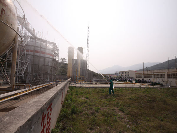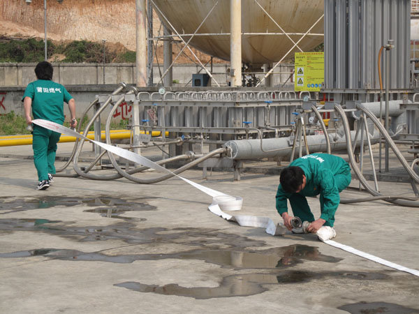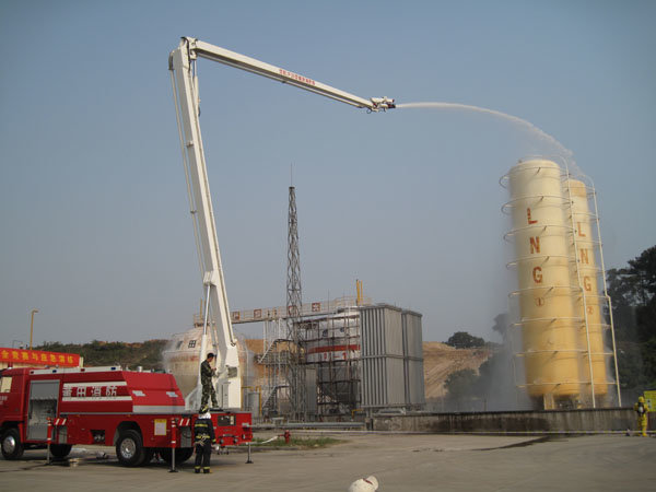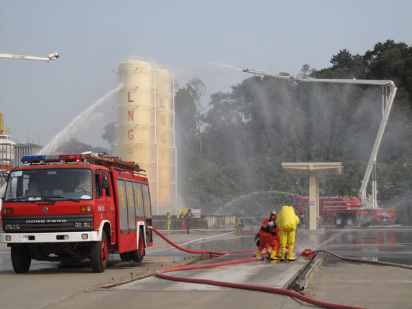 15:30分,隨著生產(chǎn)部報警聲響起,LNG灌區(qū)發(fā)生泄漏,現(xiàn)場指揮接警后立即按響報警器,指揮相關小組啟動消防水泵,對灌區(qū)進行緊急噴淋,隔離相鄰儲罐,并組織員工按預定區(qū)域到達避難位置。市消防派出2輛高噴消防車、6輛水罐消防車到達起火現(xiàn)場,火情偵檢組隨即展開偵檢,先用泄露儀對現(xiàn)場進行濃度檢測,并用隔離帶劃出相應的警戒線,保安配合警戒組疏散區(qū)域內無關人員及在場使用中的車輛熄火,同時關閉大門,禁止除消防車、搶險車外的一切車輛出入。在得知了著火位置和泄漏程度后,中隊指揮員立即下令,展開滅火行動。消防隊員穿上消防戰(zhàn)斗服、佩戴防毒面具和呼吸器、攜帶銅質工具和滅火器材迅速趕往事故儲罐,關閉儲罐根部所有閥門。而其余消防車按照預期指定位置,全方位對LNG灌體進行火災撲救。