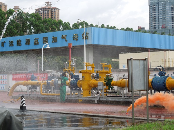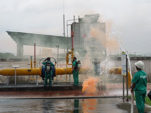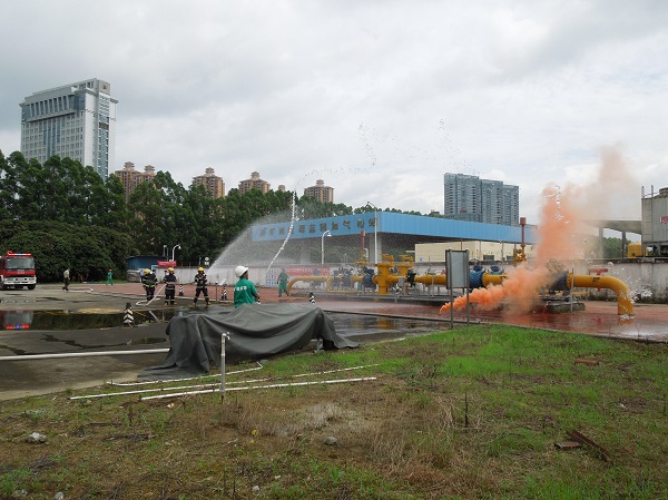 當(dāng)天上午9時許,由演練總指揮副總裁黃劍鋒正式下達演練指令,演習(xí)的內(nèi)容為荔園站遭到恐怖襲擊,調(diào)壓站設(shè)備壓力表遭到破壞,出現(xiàn)泄漏,被荔園站保安和員工發(fā)現(xiàn)并及時控制,封鎖現(xiàn)場啟動應(yīng)急機制。隨后,場站人員及消防部門通過向泄漏處噴灑消防水降低現(xiàn)場天然氣濃度,搶險組到場后對受損管線進行切換,保證天然氣正常供給,并更換受損儀表,上午10時順利搶修完畢并恢復(fù)使用。