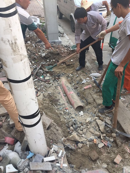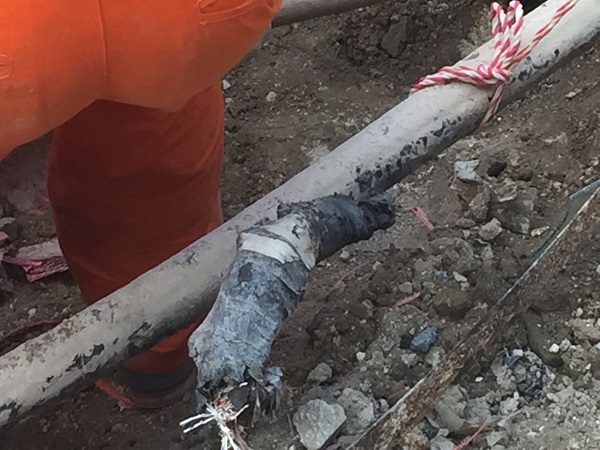 2017年7月15日上午8點(diǎn)39分,曠遠(yuǎn)能源管網(wǎng)部巡線員謝海陽(yáng)在對(duì)華林工業(yè)園區(qū)支四路巡線過(guò)程中,發(fā)現(xiàn)空氣中彌漫著一股臭味,多年從業(yè)經(jīng)驗(yàn)使他立刻引起警覺(jué),通過(guò)手持式可燃?xì)怏w檢漏儀確定了該區(qū)段存在燃?xì)庑孤?。他立即?duì)現(xiàn)場(chǎng)進(jìn)行警戒,并及時(shí)上報(bào)管網(wǎng)部經(jīng)理林元琦。林元琦考慮事故隱患重大,影響范圍廣,立即上報(bào)公司領(lǐng)導(dǎo)并啟動(dòng)應(yīng)急預(yù)案。曠遠(yuǎn)能源客服部、調(diào)度監(jiān)控中心、工程管理中心、宏盛市政工程有限公司等多方迅速聯(lián)動(dòng)。管網(wǎng)部經(jīng)理林元琦第一時(shí)間組織力量趕赴現(xiàn)場(chǎng)處理,他憑借多年的管網(wǎng)應(yīng)急處理經(jīng)驗(yàn),迅速鎖定漏氣區(qū)段,通過(guò)取點(diǎn)檢測(cè)分析,準(zhǔn)確地找出了管線漏點(diǎn)。頂著烈日冒著酷暑,為了及時(shí)恢復(fù)供氣,曠遠(yuǎn)能源管網(wǎng)部和宏盛市政的應(yīng)急搶修人員爭(zhēng)分奪秒進(jìn)行搶修。當(dāng)天下午17點(diǎn)18分,更換管段焊接完畢;17點(diǎn)58分,冷卻側(cè)漏后恢復(fù)供氣。