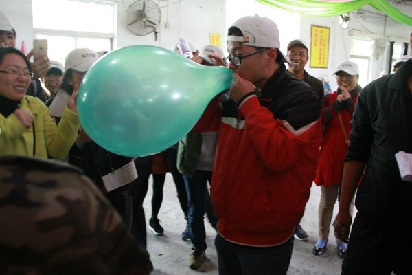 吃過午飯后,經(jīng)過一個(gè)小時(shí)的休息,拓展活動(dòng)繼續(xù)進(jìn)行。下午的第一個(gè)活動(dòng)為“牛皮吹破天”,要求各小組將所發(fā)全部氣球吹爆,總計(jì)時(shí)間最短的小組獲勝。裁判根據(jù)氣球頭數(shù)量核實(shí)戰(zhàn)績。游戲開始時(shí),各小組的男士們紛紛發(fā)揮紳士風(fēng)度,爭(zhēng)分奪秒,氣球爆炸聲此起彼伏,為了加強(qiáng)娛樂性,裁判組分別給每個(gè)小組分發(fā)一個(gè)大氣球,每次大氣球的吹爆過程都能引來隊(duì)員們的側(cè)目相看,隊(duì)員們臉上露出各異的表情,或驚奇,或興奮,或賊笑……